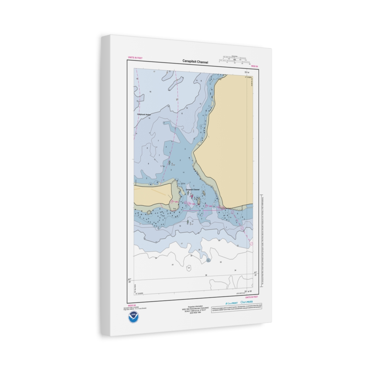 Personalized nautical chart of Canapitsit Channel at 1:5,000 scale, built from official NOAA ENC data — the same source material used for real marine navigation. Close enough to see individual docks, moorings, and channel markers. Every depth sounding and navigation aid around Canapitsit Channel is right where you’d expect it. 12″ x 18″ (Vertical).