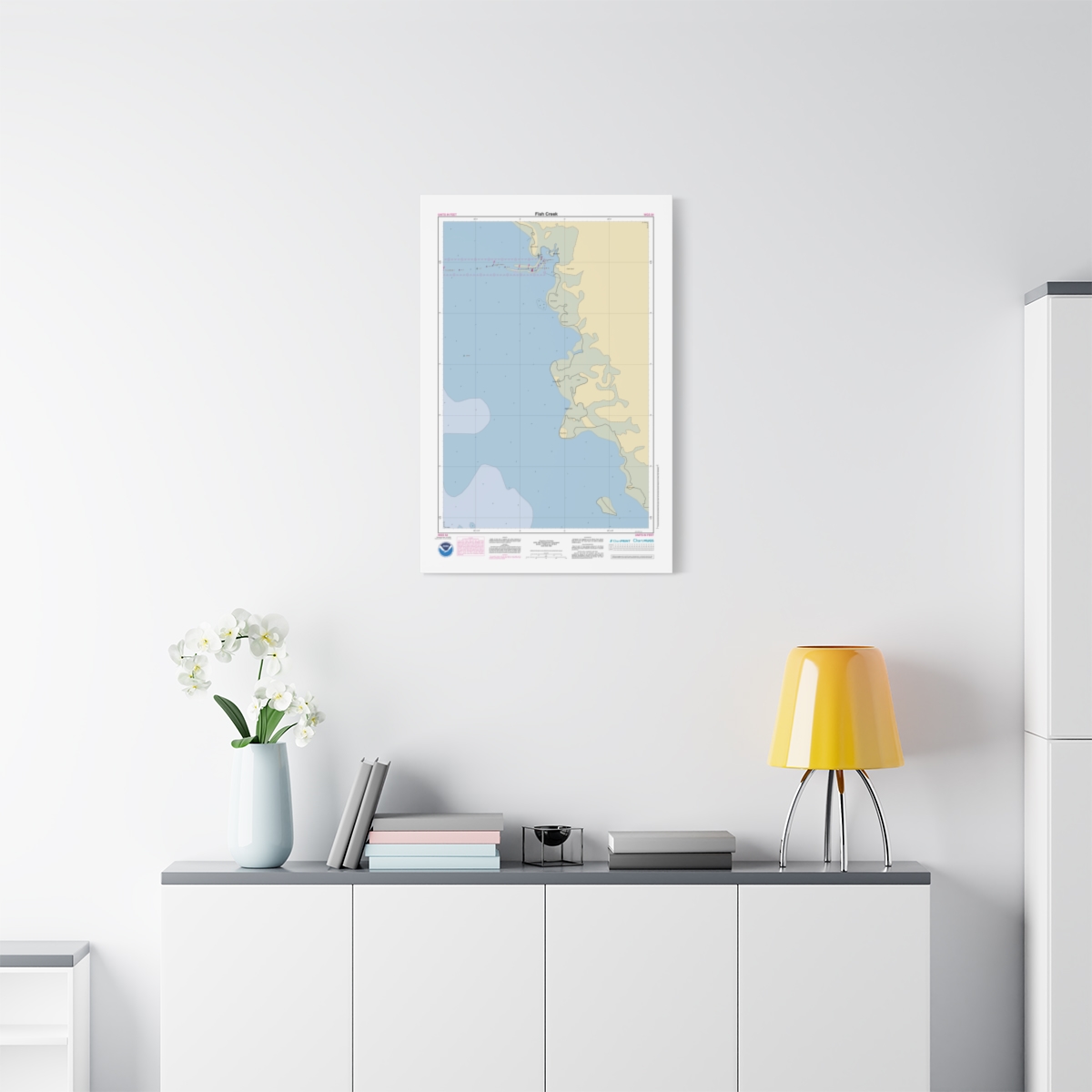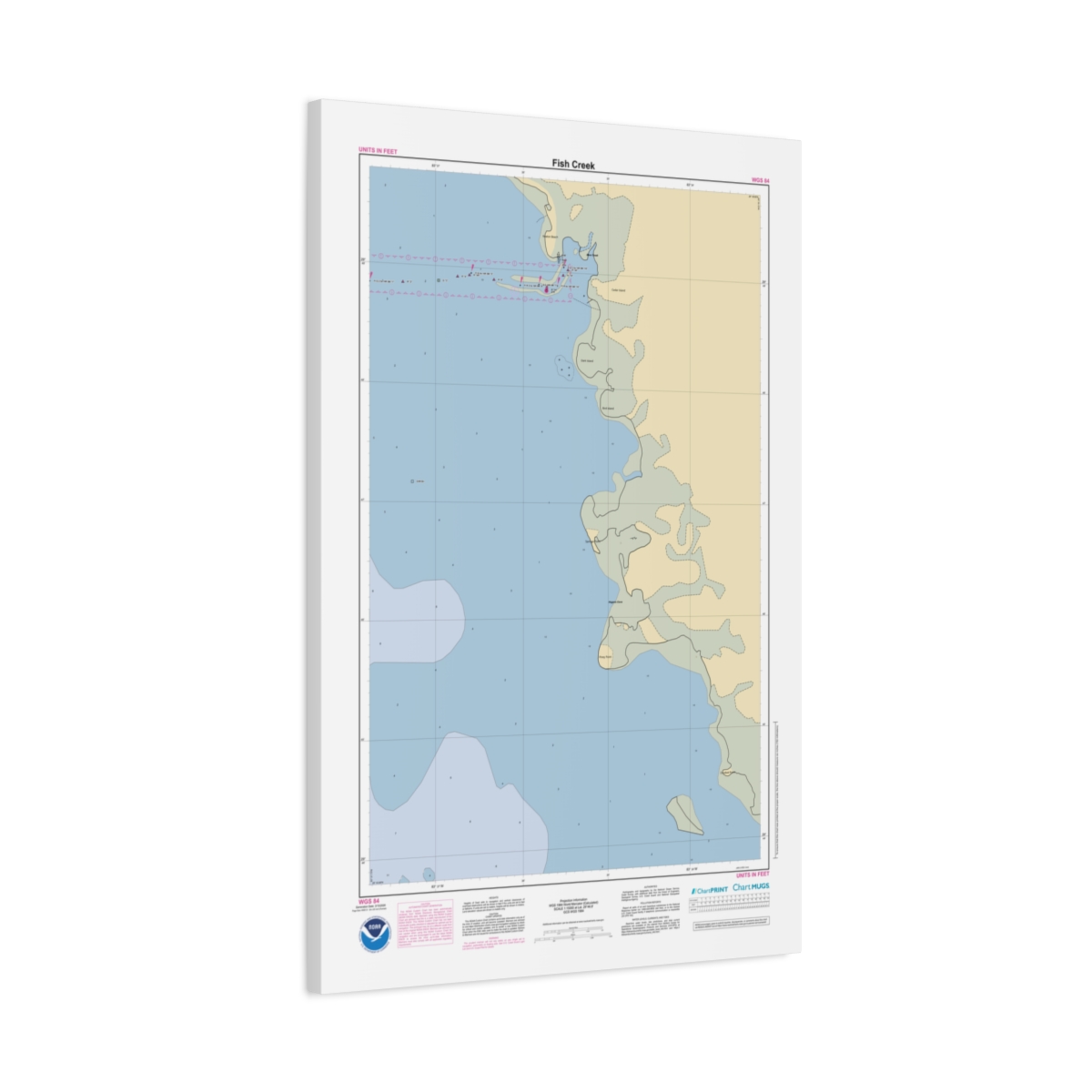 A personalized nautical chart of Fish Creek — sourced from the same NOAA ENC data used in marine navigation, printed at 1:15,000 scale. The chart covers the harbor approaches, anchorages, and coastal waterways around Fish Creek — the kind of view you’d want when planning a day on the water. Size: 22″ x 34″ (Vertical).