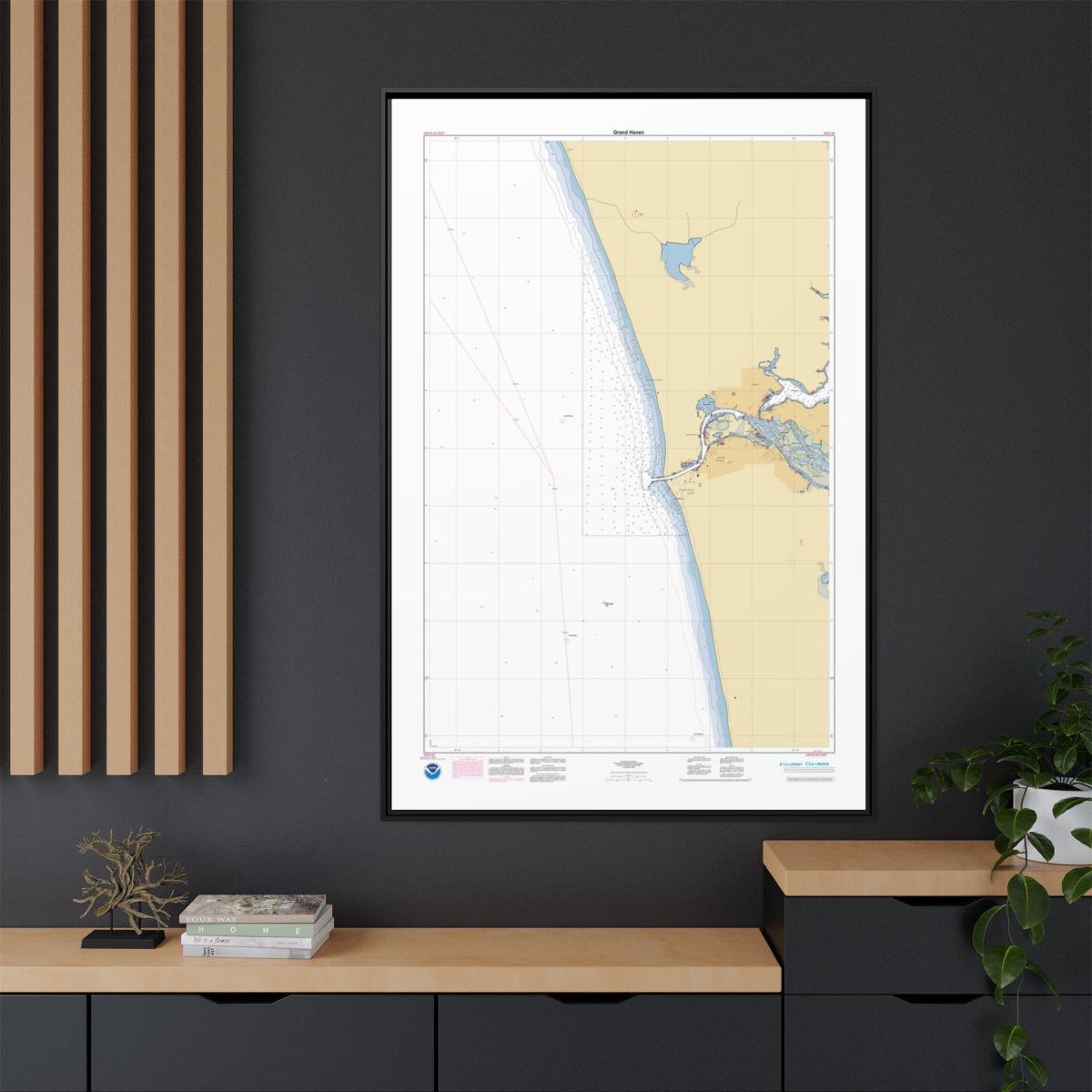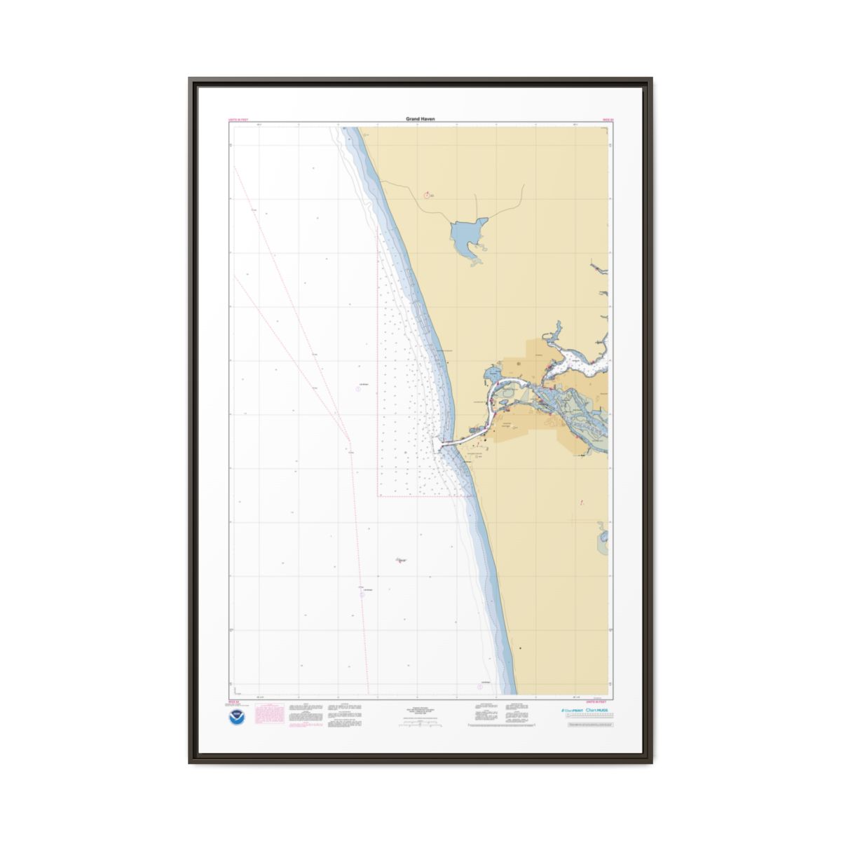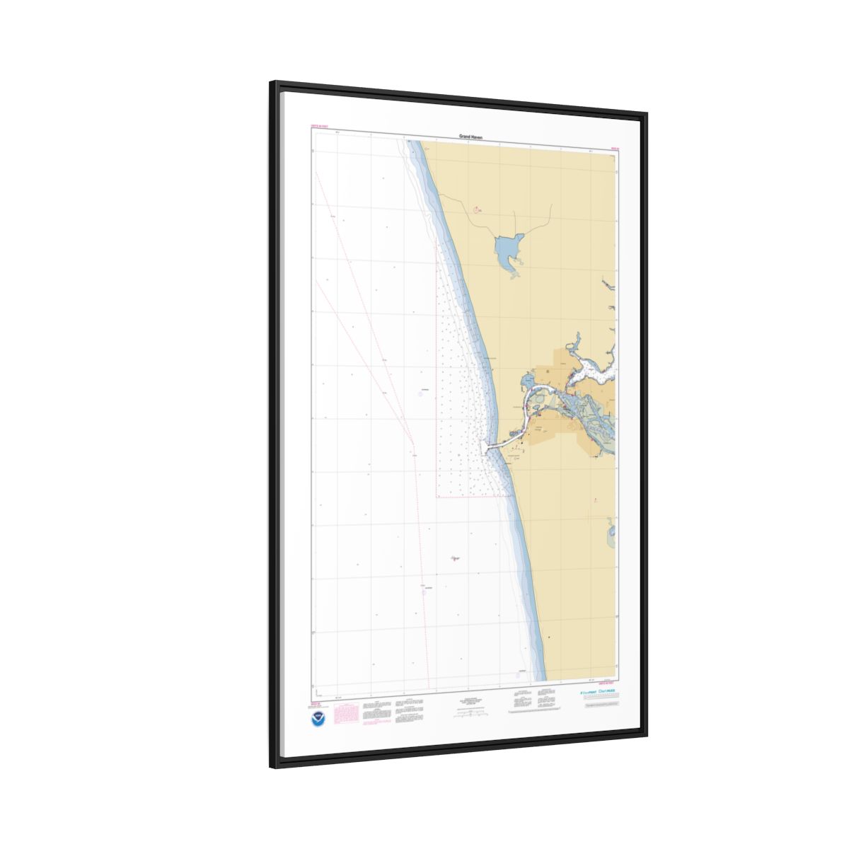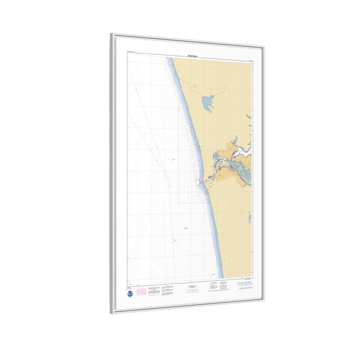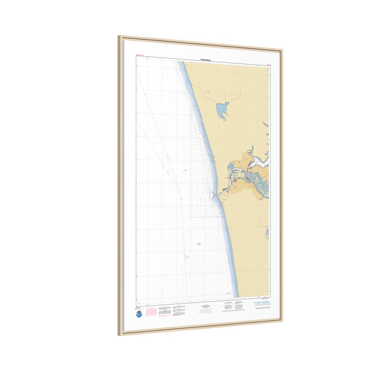 A personalized nautical chart of Grand Haven — sourced from the same NOAA ENC data used in marine navigation, printed at 1:15,000 scale. You get the full picture of the waters around Grand Haven: approach channels, anchorage areas, depth contours, and the nearshore features that define this stretch of coast. Size: 40″ x 60″ (Vertical).