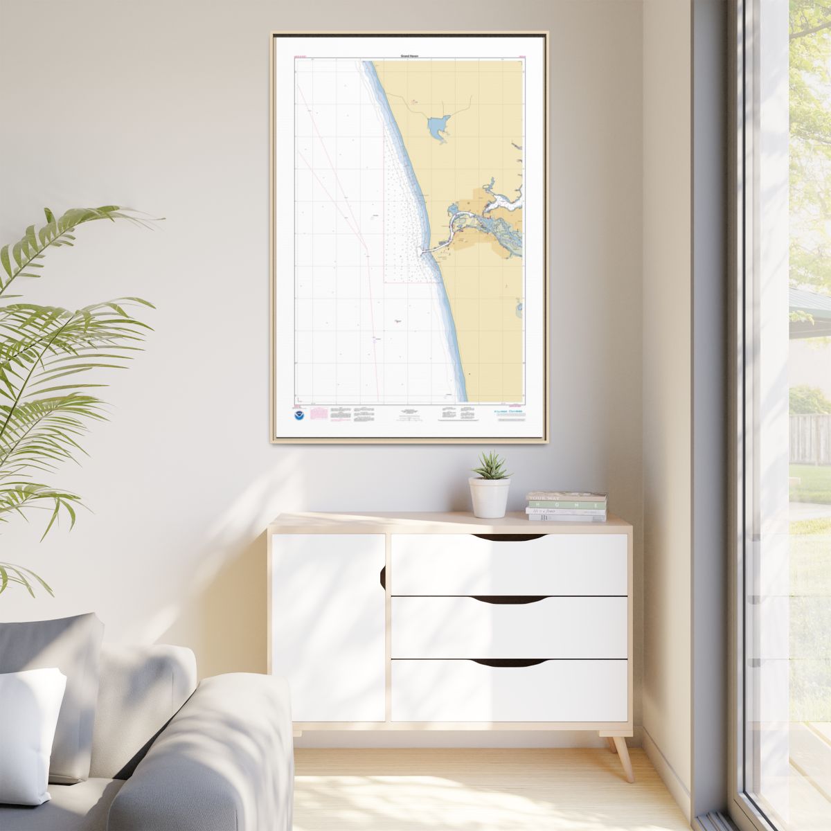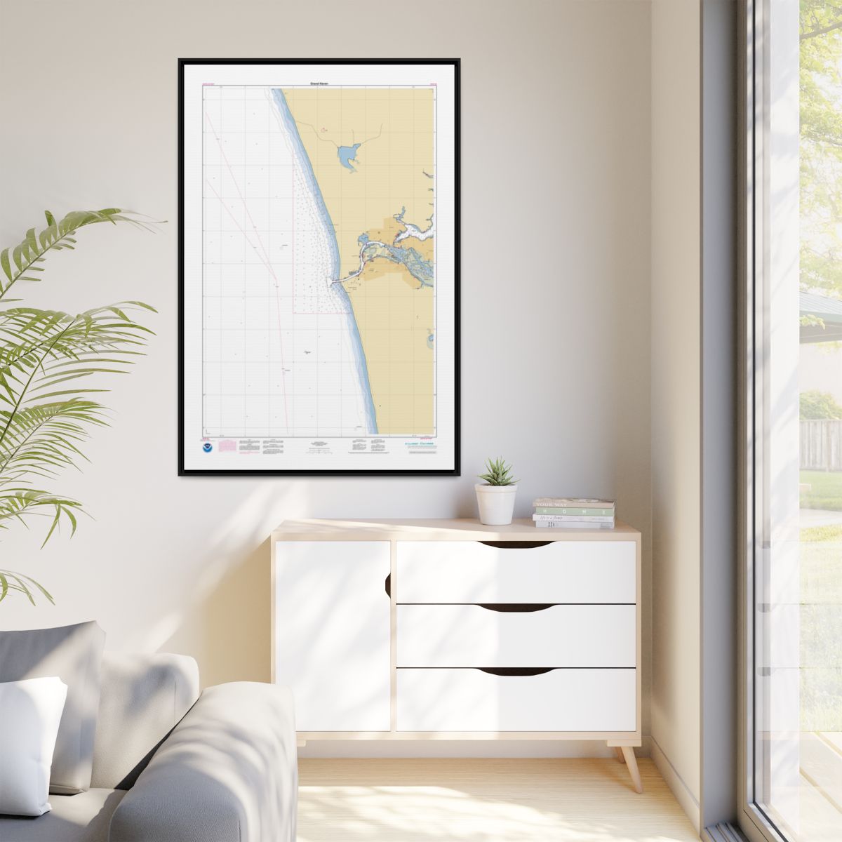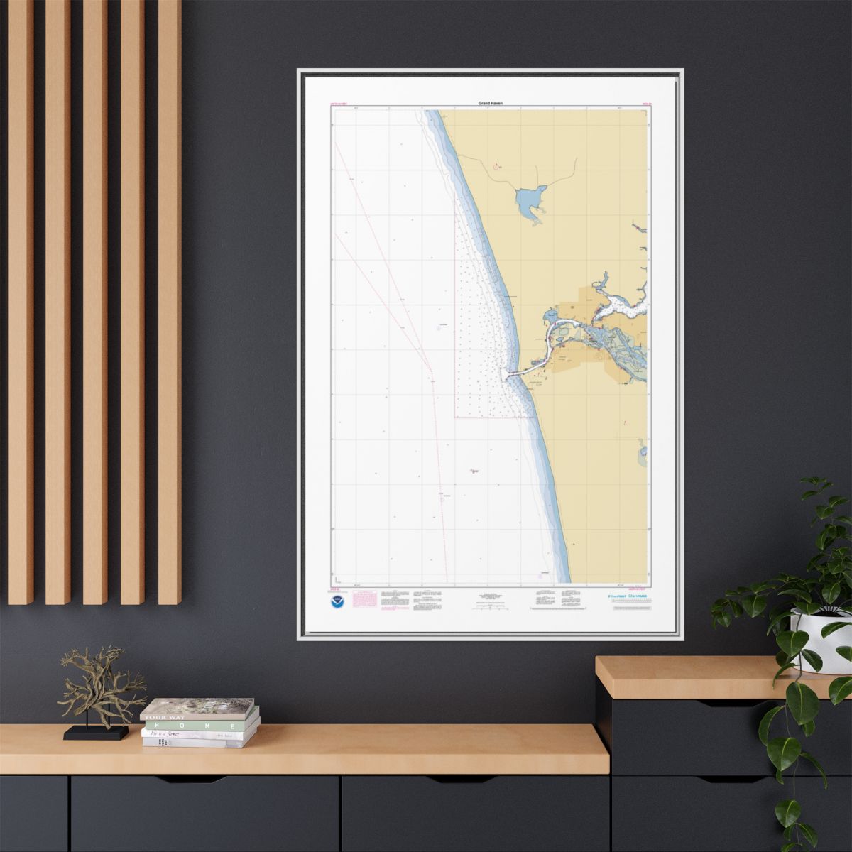 A floating frame nautical chart canvas — 1.25″ deep, available in black, espresso, white, or natural frame. The float gap between canvas and frame makes it look like a piece you’d find in a maritime museum. Arrives ready to hang.