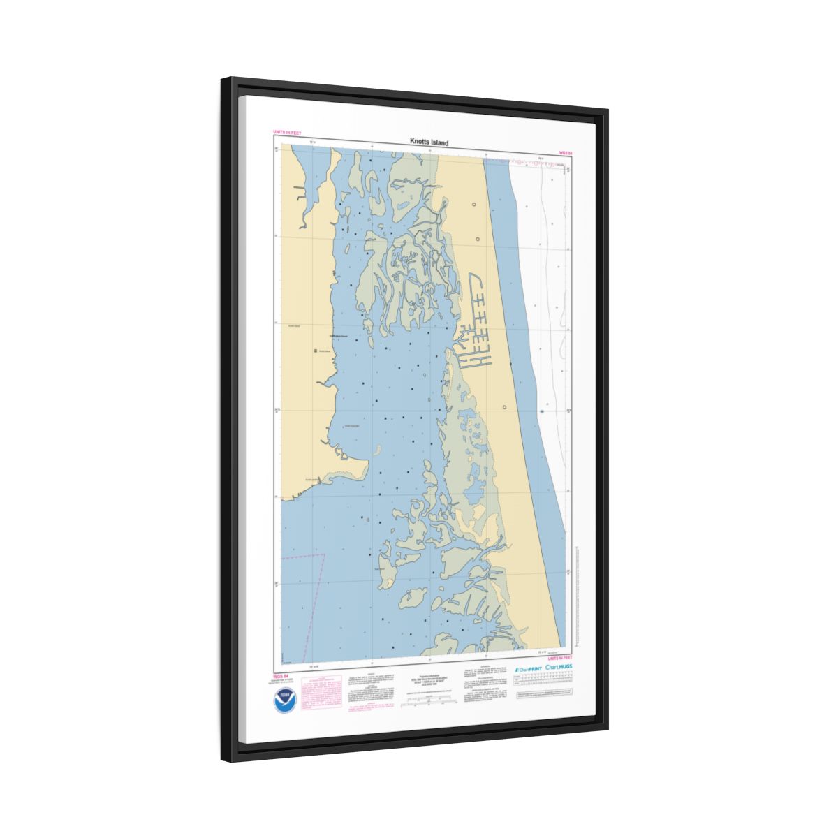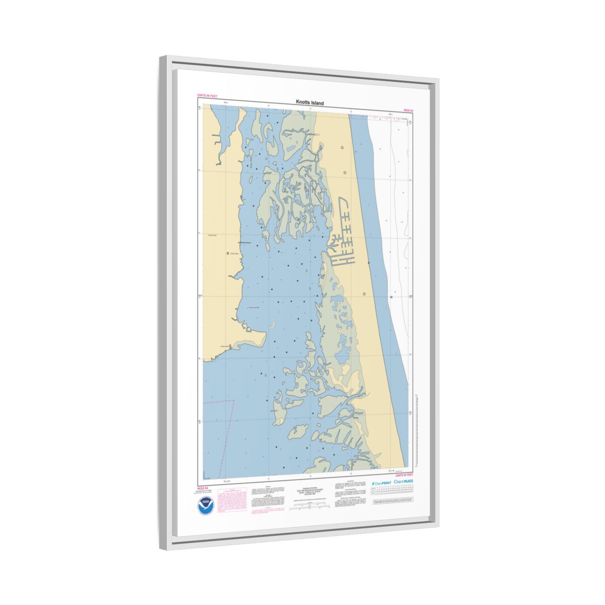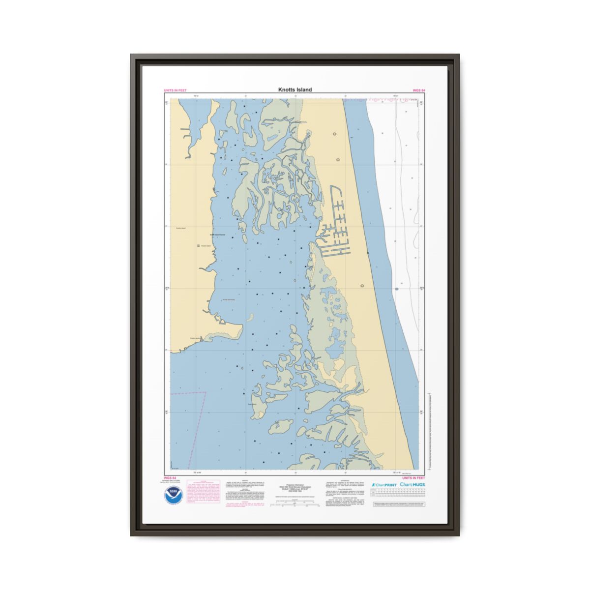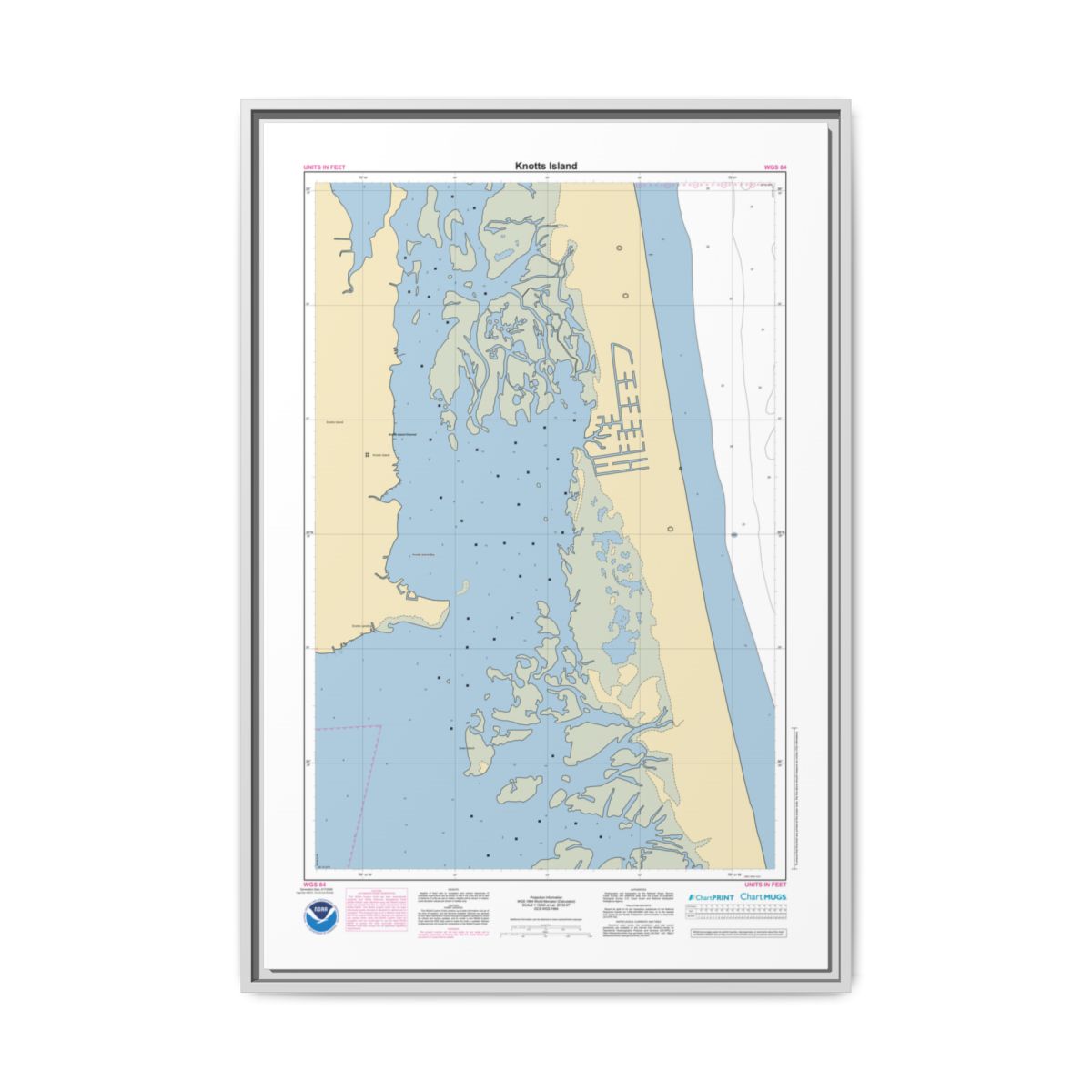 This Knotts Island chart canvas sits inside a floating frame with a gap that gives it gallery-quality depth. Cotton-polyester composite with a proprietary coating for lasting color. Frame is FSC certified radiata pine in your choice of Black, Espresso, White, or Natural. Ready to hang with sawtooth hardware.