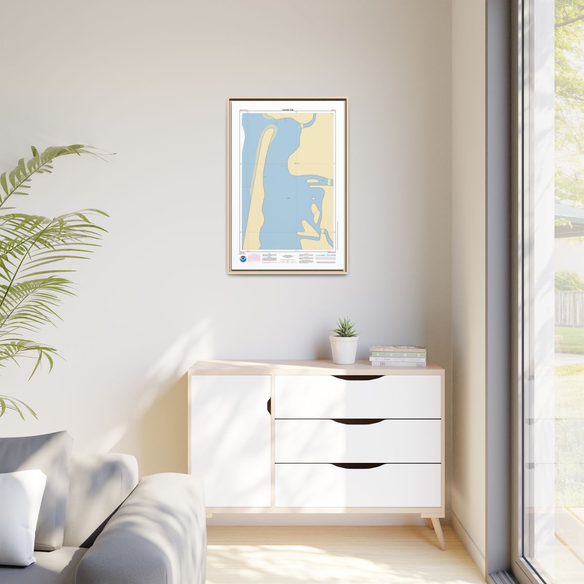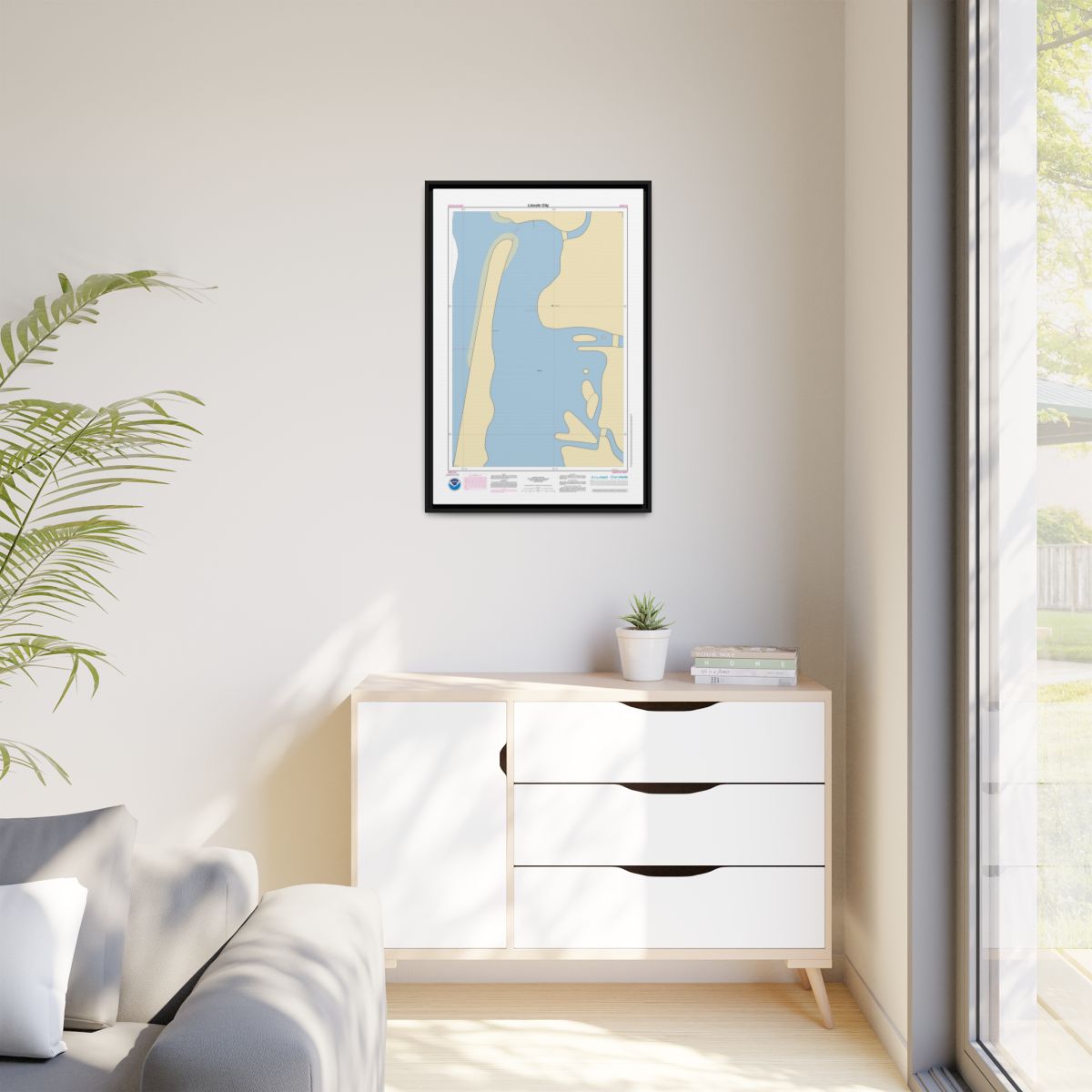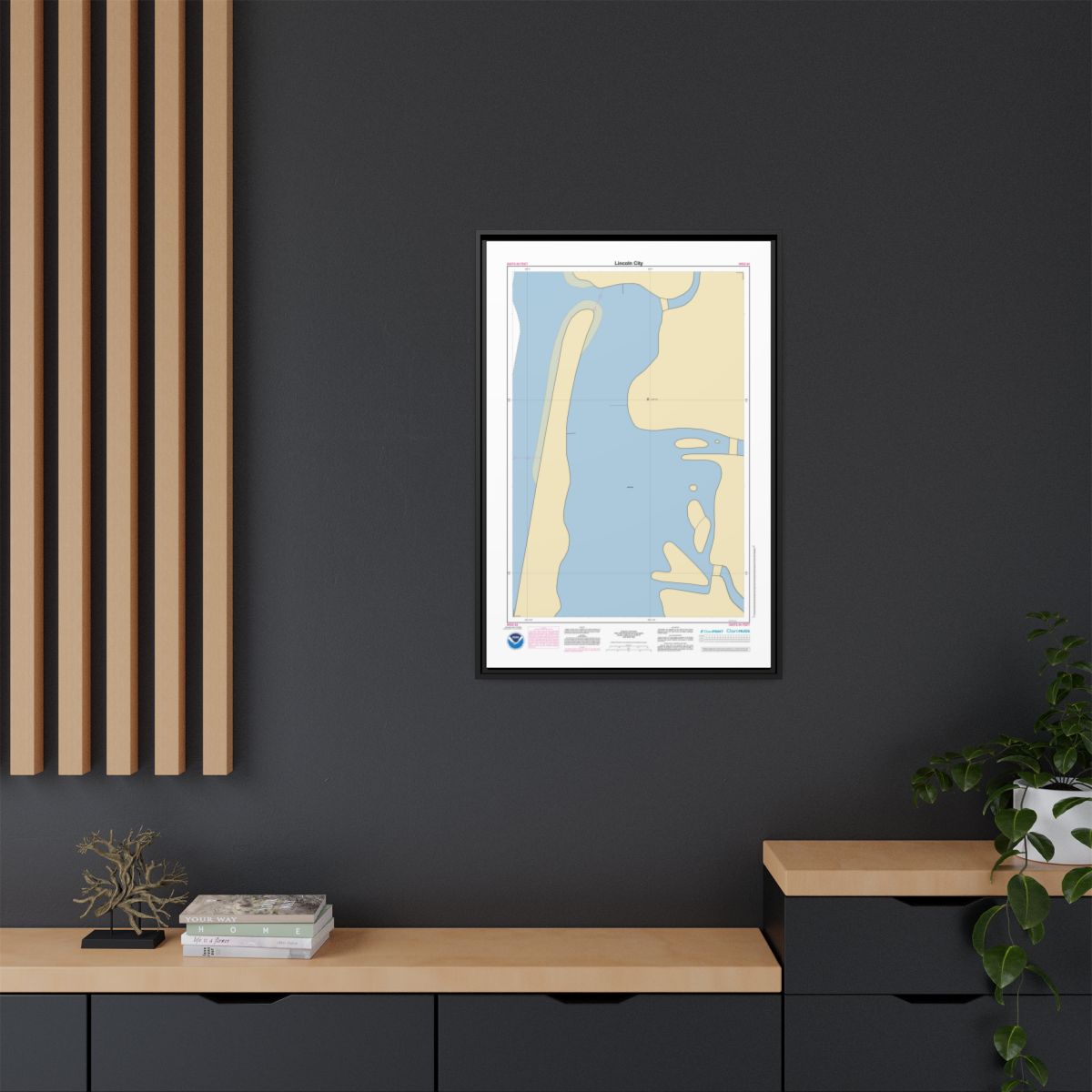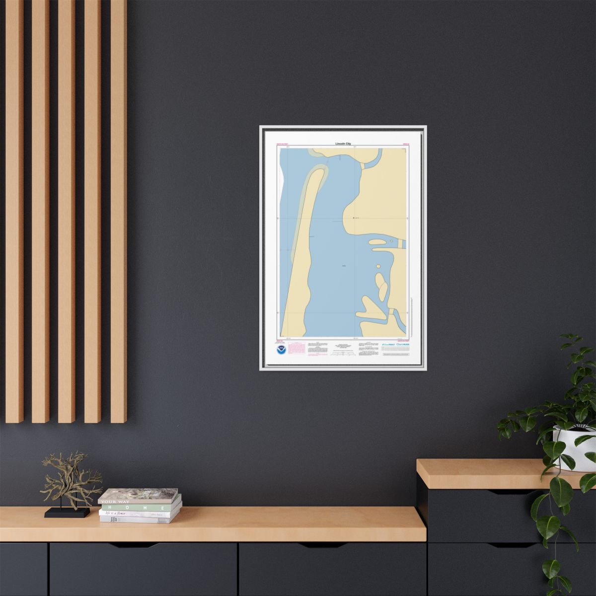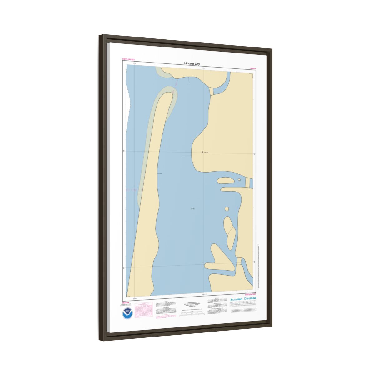 Printed on 1.25″ stretched canvas and set inside a floating frame — black, espresso, white, or natural. The gap between canvas and frame gives this nautical chart canvas a dimensional, gallery-quality look. Arrives ready to hang.