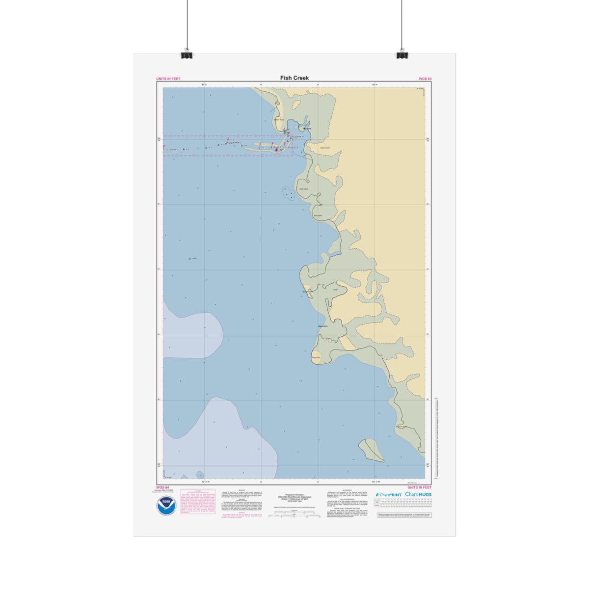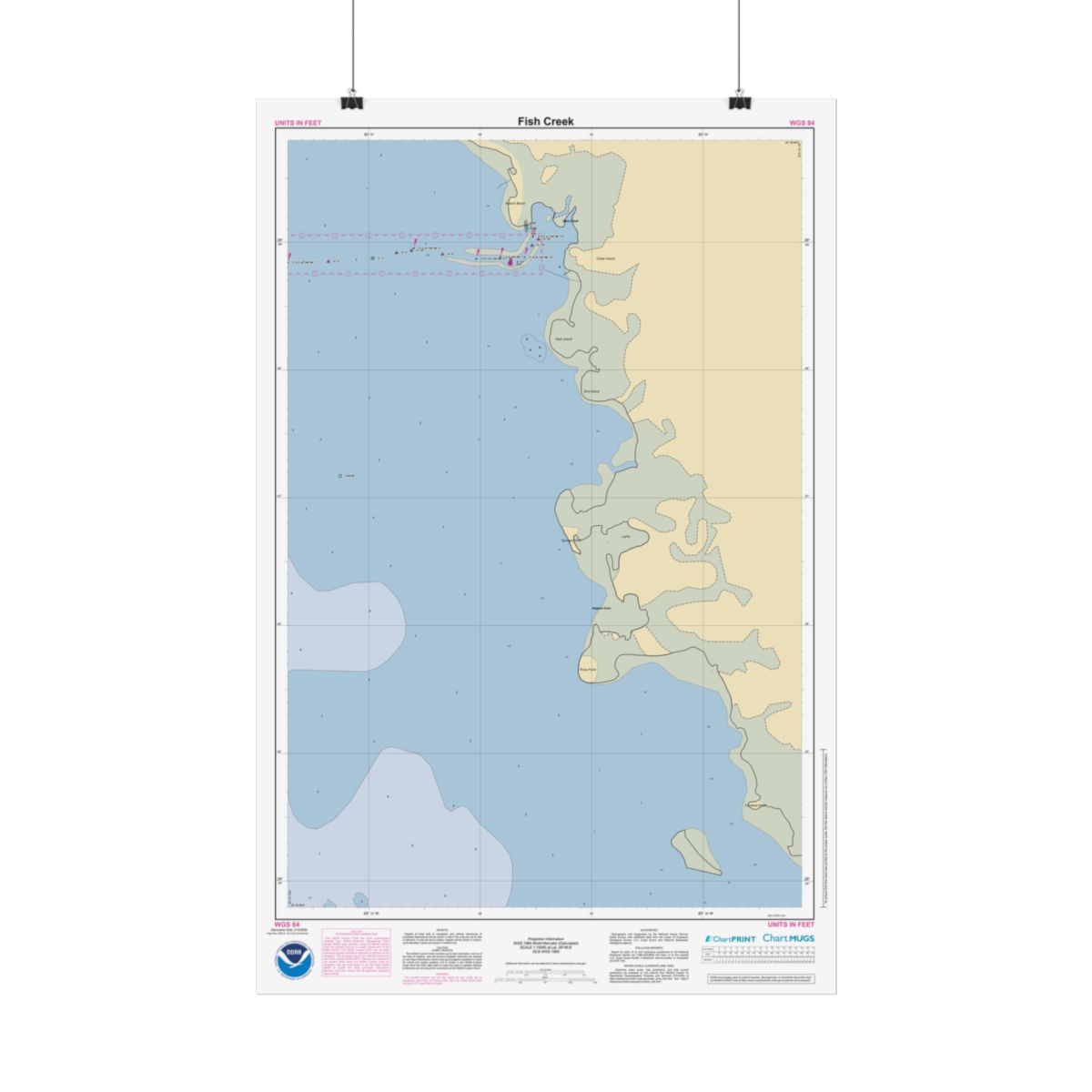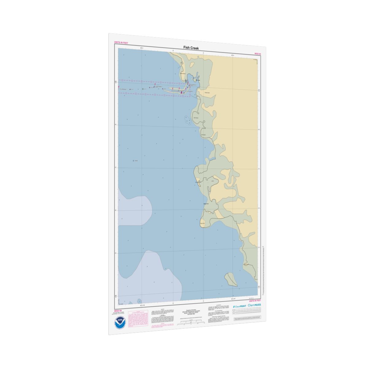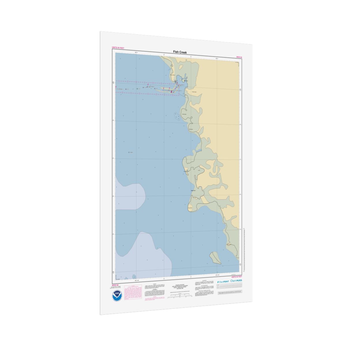 Personalized nautical chart of Fish Creek at 1:15,000 scale, built from official NOAA ENC data — the same source material used for real marine navigation. You get the full picture of the waters around Fish Creek: approach channels, anchorage areas, depth contours, and the nearshore features that define this stretch of coast. 22″ x 34″ (Vertical).